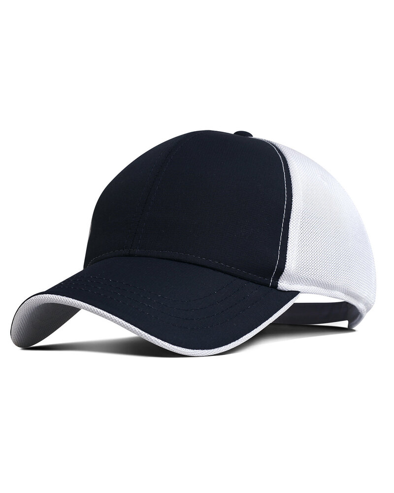 Lined nylon mesh back panels; Pearl nylon with UPF 50 sun protection front panels; Contrasting visor tip & under visor; Moisture-wicking sweatband; Pro stitching; Structured stiff buckram mid-profile; Pewter dye cut buckle & grommet closure;