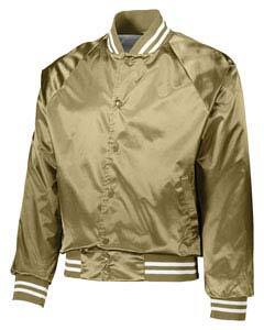 Outer Shell: 100% nylon satin ; Liner: 100% polyester brushed tricot; Water-resistant; Snap front; Raglan sleeves for maximum mobility ; Striped rib-knit collar cuffs and bottom band ; Front pockets; Tear away label;