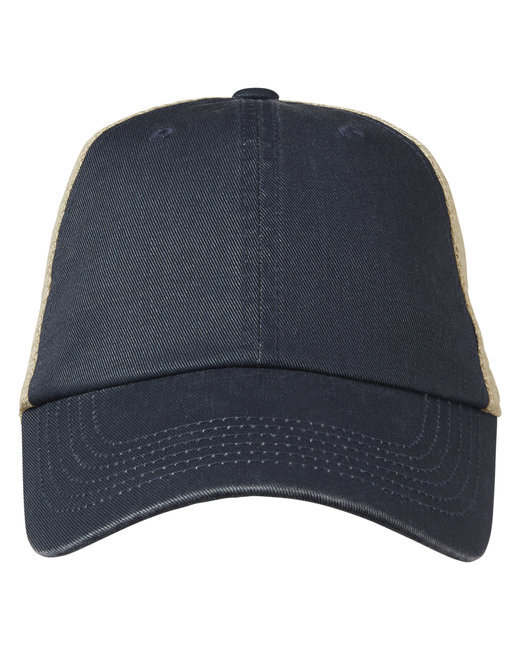 100% vintage washed cotton twill; 100% poly soft mesh; One size fits most; 6-panel; Unstructured; Low-profile; Adjustable snap-back closure; Top of the World headwear is transitioning to J America Headwear; Mixed branding may occur for a period of time;