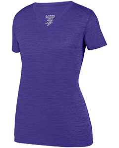 100% polyester heathered wicking knit ; Wicks moisture away from the body ; Ladies' fit ; Pad print label ; Self-fabric V-neck collar ; Set-in sleeves ; Double-needle hemmed bottom and sleeves.;