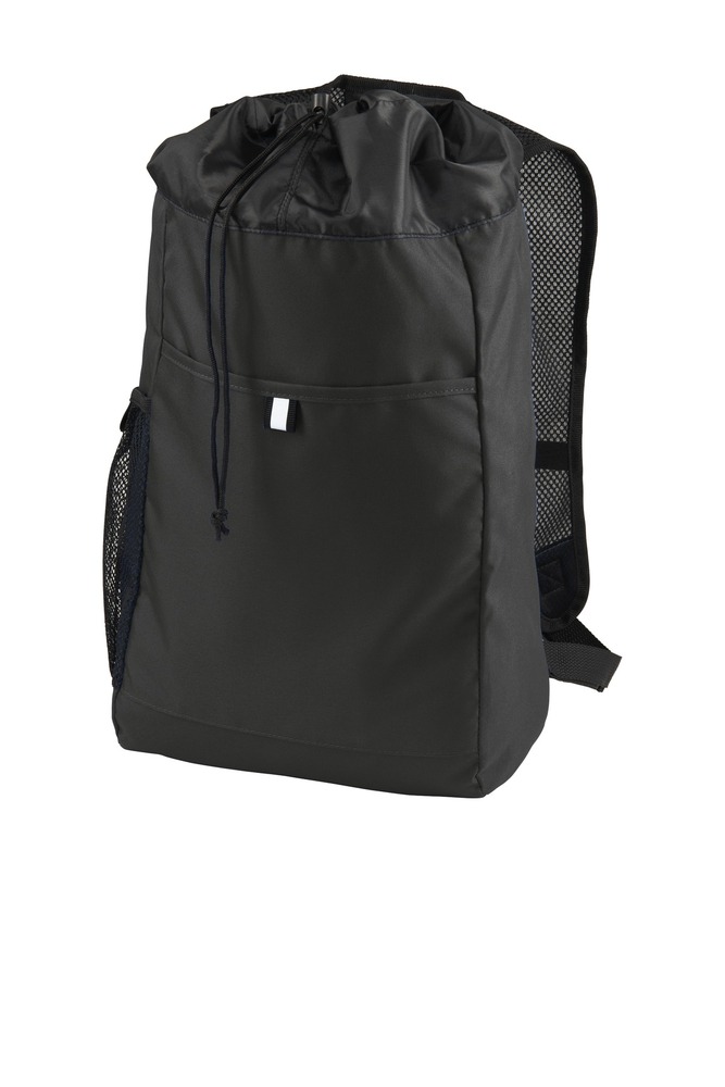 We merged the best features of a pack and a cinch to create this versatile backpack. 300 denier polyester, 210 denier polyester Drawstring top closure Interior hanging pocket with hook and loop closure for easy access to valuables Spacer mesh comfort straps with built-in grab handle and reflective trim Lightly padded back for structure and comfort Front slip pocket for easy decoration Reflective webbing tab on slip pocket and side mesh beverage pocket Dimensions: 20'h x 15'w x 5'd; Approx. 1,500 cubic inches Note: Bags not intended for use by children 12 and under.
