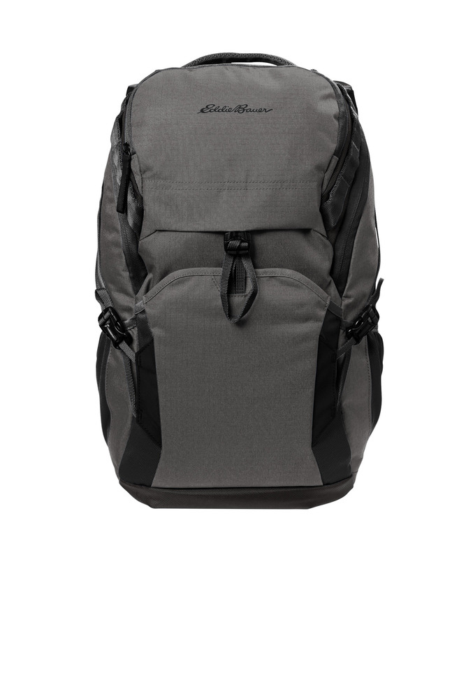 This rugged backpack is for day hikes to travel sojourns. 300D ripstop polyester, 1,680D ballistic polyester Spacious main compartment Dedicated back padded laptop compartment Front zippered valuables compartment Front quick-release buckled slip pocket Padded daisy chain grab handle Side compression straps Adjustable slide sternum strap Padded ergonomic shoulder straps FreeCool ® Air back panel Interior organization panel with zippered pocket and key fob Back trolley pass through Contrast Eddie Bauer logo on front pocket and back shoulder strap Laptop sleeve dimensions: 19'h x 11'w x 1'd Dimensions: 20.5'h x 11.5'w x 8'd; Approx. 1,886 cu. in. Capacity: 1,525.6 cu. in./25 L Weight: 1.7 lbs./0.75 kg Note: Bags not intended for use by children 12 and under.