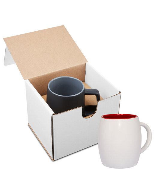 - Kraft gift box packed with one 14 oz. (414 mL) barrel-shaped ceramic mug with white exterior and color interior