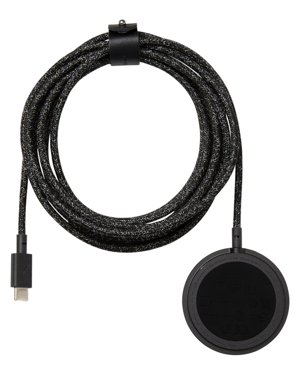 - Nylon braided cable, genuine leather belt, aluminum housed charging pad, non-slip silicone base