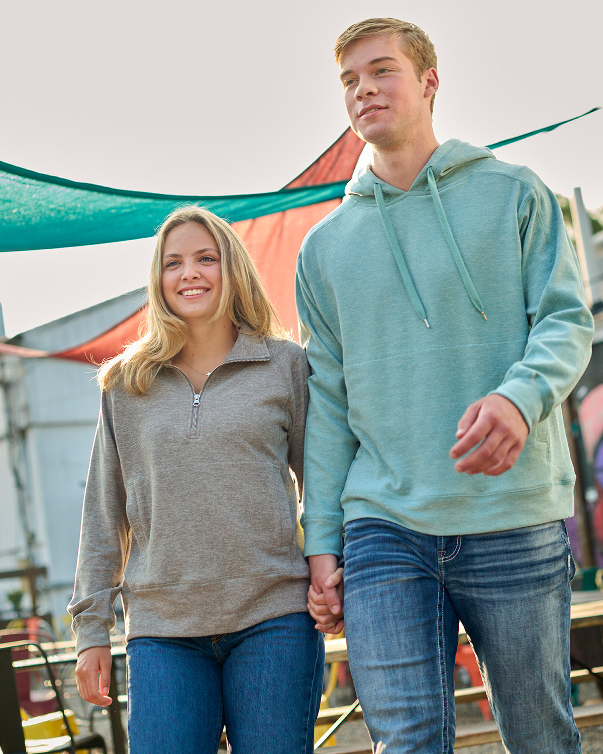 - 7.4 oz., 90% polyester, 10% spandex brushed heathered fleece